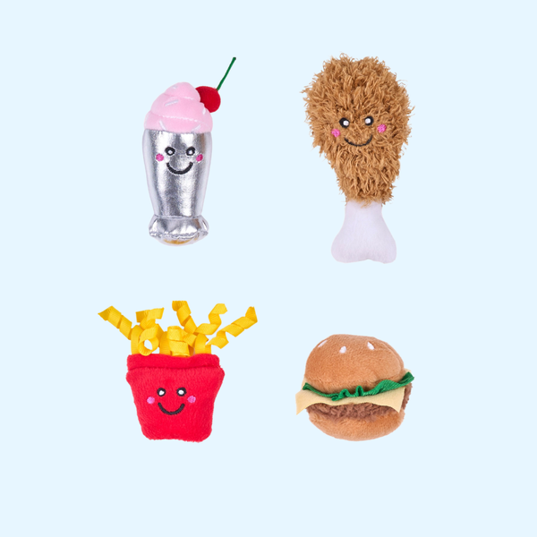 Éveillez les instincts de chasseur de votre félin avec le ZippyClaws® NomNomz® Fast Food Pack de ZippyPaws ! Ce lot de 4 mini peluches sur le thème de la restauration rapide (soda, cheeseburger, milkshake et frites torsadées) fera le bonheur de tous les petits gourmets à moustaches. 😻